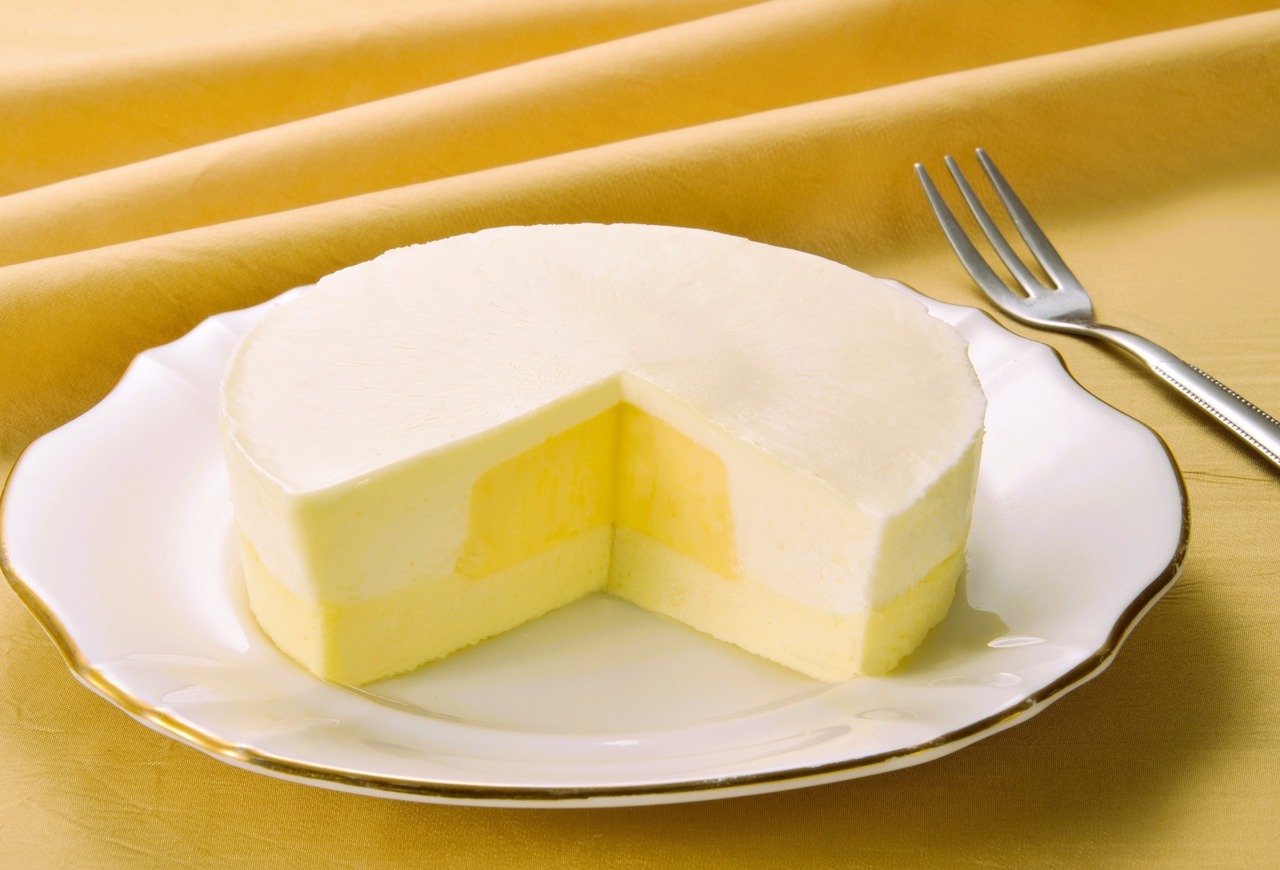 北海道原料を使用した2層のチーズケーキの真ん中をカットすると、コク生チーズカスターがあふれ出ます。ベイクチーズケーキ+生チーズケーキ+コク生チーズカスタード
