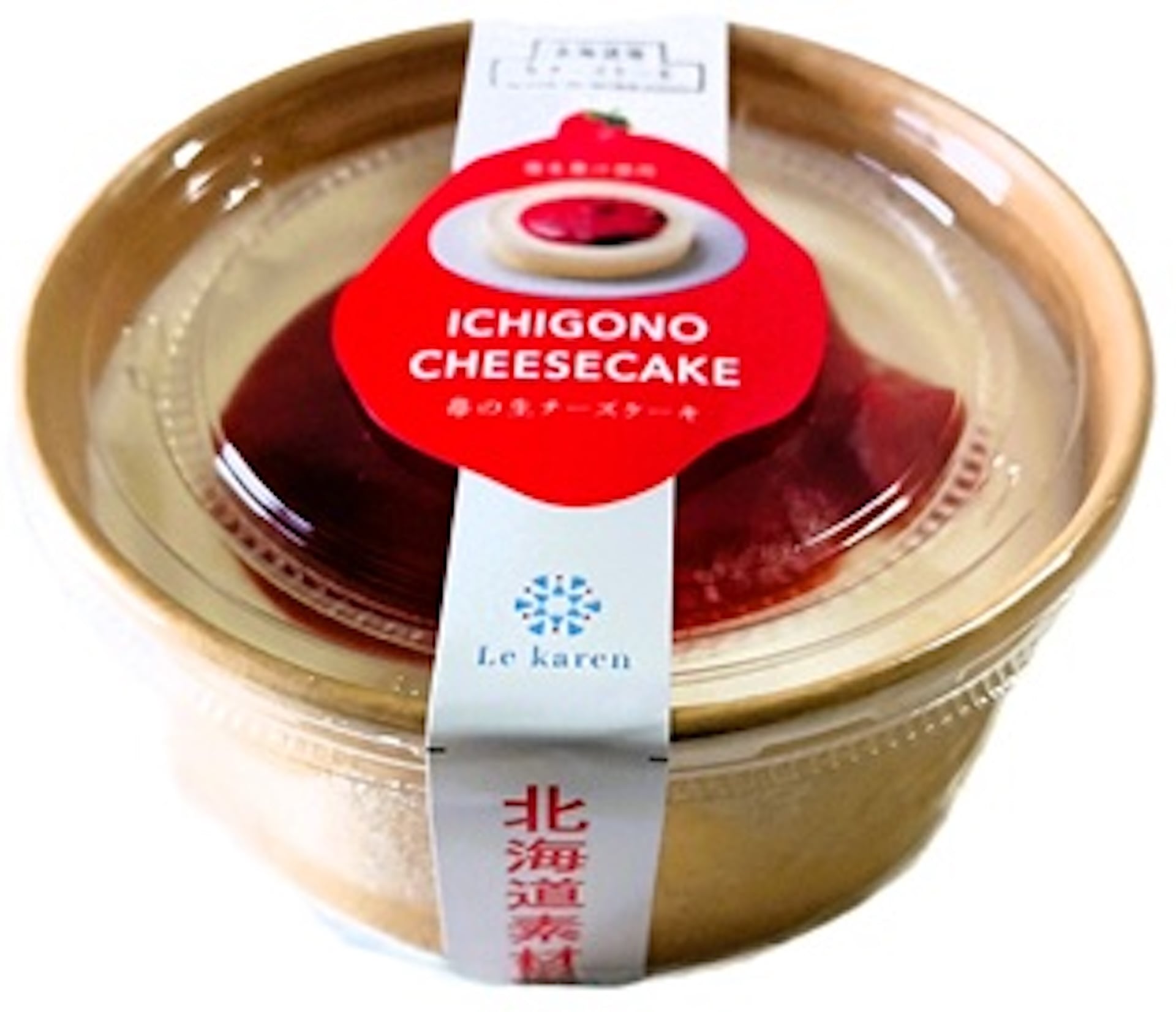 北海道原料を使用した2層のチーズケーキです。ケーキの上には苺の生果汁ピューレが載ってます。スフレチーズケーキ+生チーズケーキ+苺生果汁