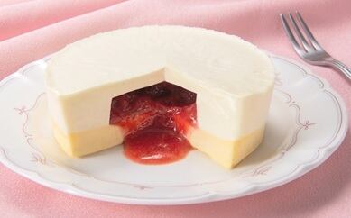 北海道原料を使用した2層のチーズケーキの真ん中をカットすると、苺の生果汁ピューレがあふれ出ます。ベイクチーズケーキ+生チーズケーキ+苺生果汁