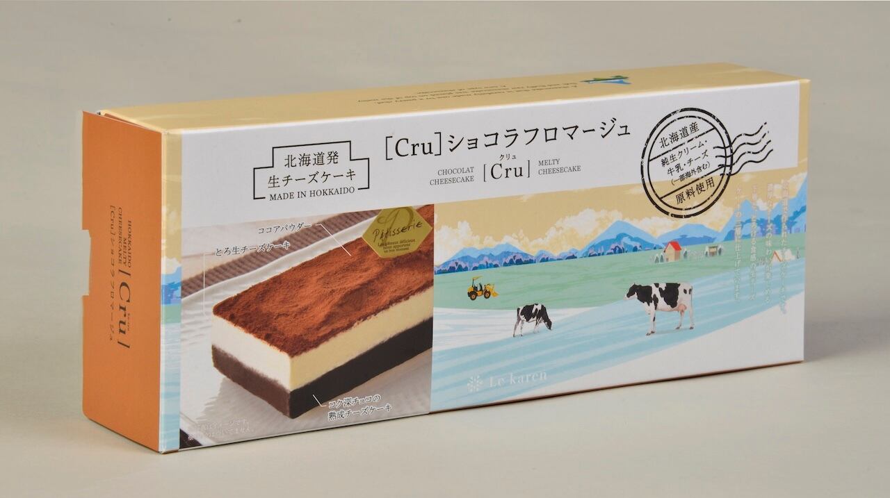 [Cru]シリーズは、新しい美味しさをテーマに、主に北海道産原料を使用し、北海道で作られたチーズケーキです。 カカオ分60%のチョコレートと3種類のチーズを配合した、ショコラとチーズの融合熟成を楽しめるチーズケーキです。