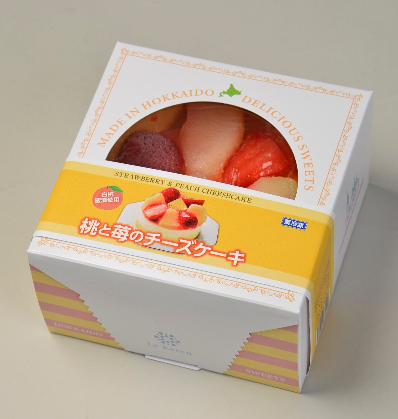北海道原料を使用した2層のチーズケーキの上に桃と苺果実が載ったプレミアムなケーキです。クリスマスや年末年始、晴れの日に楽しめるプチ贅沢なスイーツです