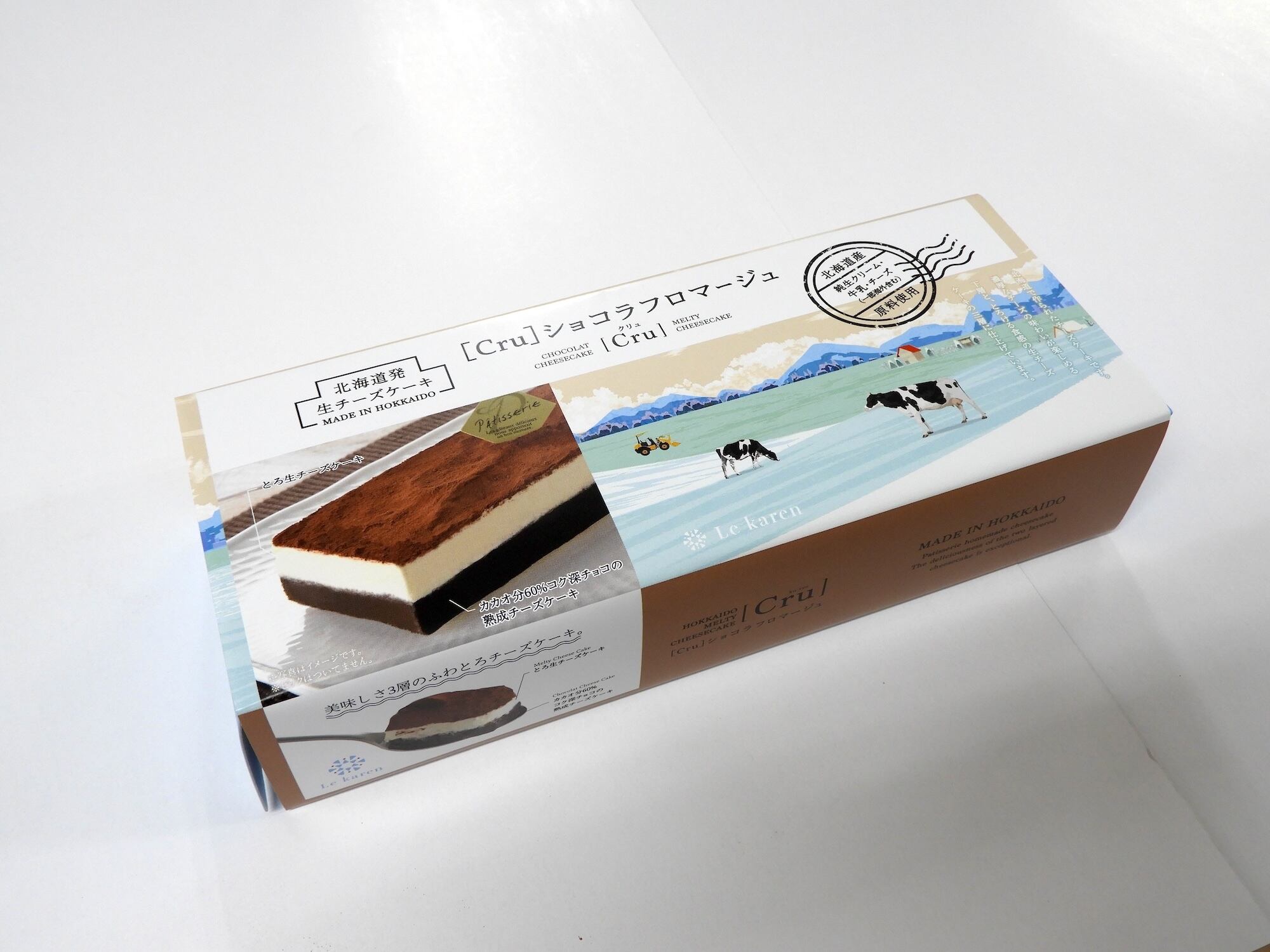 [Cru]シリーズは、新しい美味しさをテーマに、主に北海道産原料を使用し、北海道で作られたチーズケーキです。 カカオ分60%のチョコレートと3種類のチーズを配合した、ショコラとチーズの融合熟成を楽しめるチーズケーキです。