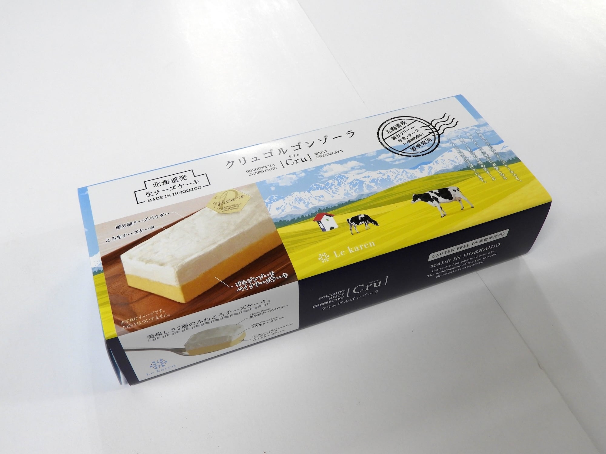 [Cru]シリーズは、新しい美味しさをテーマに、主に北海道産原料を使用し、北海道で作られたチーズケーキです。 まろやかな塩味のゴルゴンゾーラチーズを随所に使用した、とろける食感の2層からなる生チーズケーキです。